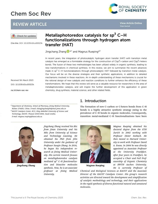 近日,我校药学院张京昌博士以第一作者在国际顶级学术期刊《Chemical Society Reviews》上发表题为“Metallaphotoredox catalysis for sp3 C-H functionalizations through hydrogen atom transfer (HAT)”的综述论文。